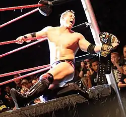 On January 27, 2008, the Miz competed in the Royal Rumble match at the Royal Rumble event, entering at number 16 and lasting over 13 minutes, before being eliminated by Hornswoggle, who spent most of the match hiding under the ring. In February, the Miz and Morrison were given a streaming segment on the WWE website named The Dirt Sheet in which they mocked other wrestlers and facets of pop culture, showing off their promo skills.[70] Morrison and the Miz co-wrote each episode of The Dirt Sheet each week.[71] The Miz competed in a battle royal on the pre-show of WrestleMania XXIV on March 30 but was unsuccessful in winning after being eliminated by Jamie Noble. The Miz and Morrison successfully retained the titles against Kane and CM Punk at Judgment Day on May 18[72] and Finlay and Hornswoggle at Night of Champions on June 29,[73] before dropping the championship to Curt Hawkins and Zack Ryder at the Great American Bash on July 20 in a fatal four-way match which also involved Jesse and Festus, ending their reign at 250 days.[74] Neither the Miz nor Morrison were pinned as Hawkins pinned Jesse to win the titles.[74] The Miz competed in the Championship Scramble for the ECW Championship on September 7 at Unforgiven, which was won by Matt Hardy. The Miz and Morrison soon followed a feud with Cryme Tyme (Shad Gaspard and JTG) as a battle of their webshows, Word Up and The Dirt Sheet. They were voted into a match with, and defeated Cryme Tyme on October 26 at Cyber Sunday.[75] The team also feuded with D-Generation X (DX) (Triple H and Shawn Michaels).[76][77] On the 800th episode of Raw, the Miz and Morrison competed in a match against DX, and were defeated.[77] The duo joined John "Bradshaw" Layfield (JBL)'s team (which also included Kane and Montel Vontavious Porter) in a losing effort against Shawn Michaels' team (also including Shad Gaspard, JTG, Rey Mysterio and The Great Khali) at Survivor Series on November 23. The Miz then entered a tournament to determine the number one contender for William Regal's Intercontinental Championship, but lost to Mysterio in the first round on the December 1 episode of Raw. On December 13, the Miz and Morrison defeated Kofi Kingston and CM Punk to win the World Tag Team Championship during a WWE house show in Hamilton, Ontario, Canada.[78]