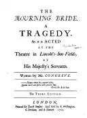The Mourning Bride, originally titled as The Mourning Bride: A Tragedy, is a tragedy satire play written by the English playwright William Congreve. It premiered in 1697 at Lincoln's Inn Fields, London. It revolves around the secret love between Almeria, the daughter of King Manuel of Granada, and Alphonso, the son of King Anselmo of Valencia, who is her father's enemy. It was popular for its satirical qualities during the Restoration period, and is notable for containing the quote, "Hell hath no fury like a woman scorned".