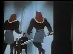 Sensing that the needle missed, the sarcophagus opens and a light from the dead king's jeweled amulet awakens his giant guards. The guards attack Clark, Lois, and the professor. Clark is thrown into a sarcophagus, where he quickly changes into Superman. As Superman, he defeats the giant guards and saves Lois and the professor from a grim demise by fire.