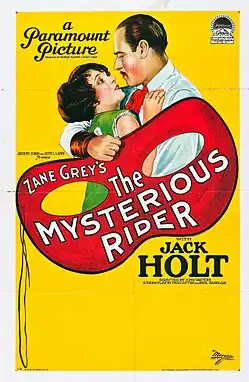 The Mysterious Rider is a 1927 American silent Western film directed by John Waters and written by Paul Gangelin, Zane Grey, Alfred Hustwick, and Fred Myton. The film stars Jack Holt, Betty Jewel, Charles Sellon, David Torrence, Tom Kennedy, Guy Oliver, and Al Hart. The film was released on March 5, 1927, by Paramount Pictures.[1][2]