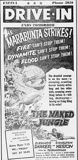 The Naked Jungle is a 1954 American adventure film directed by Byron Haskin, and starring Charlton Heston and Eleanor Parker. Telling the story of an attack of army ants on a Brazilian cocoa plantation, it was based on the 1937 short story "Leiningen Versus the Ants" by Carl Stephenson.[2]