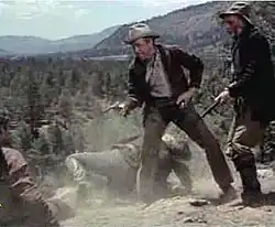 Vandergroat fires on Kemp and Anderson from the cliff above, but Lina grabs the rifle barrel. While Anderson exchanges gunfire with Vandergroat, Kemp uses one of his spurs as a piton to climb the cliff and outflank Vandergroat.