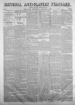 The Standard was a weekly newspaper that was published concurrently in New York City and Philadelphia (1854–1865). It published the essays, debates, speeches, events, reports, and anything newsworthy that related to the question of slavery in the United States and other parts of the world. Its audience were the members of the American Anti-Slavery Society and abolitionists in the north. Its two key focuses in the elimination of slavery were religion and politics, which considered slavery as an evil institution. Its strong religious appeal asserted that God was the only being that could end slavery. However, they did assign value to political action. The paper only contained six columns, but its personal accounts of slavery helped express the feelings and moods surrounding the controversy for thirty years. It began being published during a time that the American Anti-Slavery Society was torn over tactics of how to go about emancipation.[2]