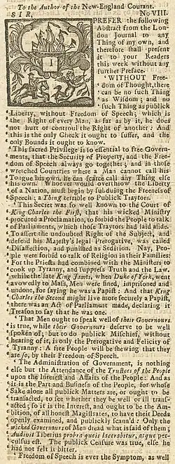 - ^ The actual order read: "James Franklin should no longer print or publish the newspaper called The New England Courant, or any Pamphlet or paper of the like Nature, Except it be first Supervised, by the Secretary of this Province"[39][40][41]