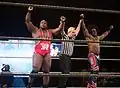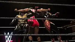 ![]() The New Day's Kofi Kingston (left) and Xavier Woods at a WWE Live tour event in 2016 | |