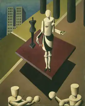 "New Eve" describes an ironic ideal of a modern 1920s woman. A model in a fashionable skirt (but no blouse, her torso being a beige cylinder with abstract breasts (and her head a featureless oval)) holds in her left hand the green Apple of Sin, and in her right a clutch or checkbook. Behind her on the levitating ocher platform is a black dress form, and in the far background a bifurcated modern skyscraper. In the immediate foreground are two mannequin in a boxing pose whose hands, unlike the female model's, are spheres.
