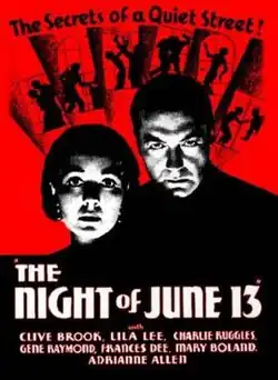 The Night of June 13 is a 1932 American pre-Code mystery film directed by Stephen Roberts. The film stars Clive Brook, Frances Dee, Charlie Ruggles, Gene Raymond, Lila Lee, Mary Boland and Adrianne Allen. The film was released on September 23, 1932, by Paramount Pictures.[1][2]