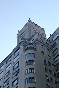 - ^ The second through ninth stories each have a short window, a vertical "slit window", a single casement, a double casement, and a triple casement from right to left. The 10th to 14th stories have five single-casement windows. At the 16th and 17th story, there is a single casement, a double casement, and a setback from right to left.[37]