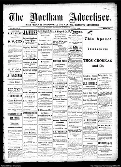 The Northam Advertiser was a newspaper published in Northam, Western Australia. It was published from 1895 to 1986. Between 1956 and 1959, it was titled the Northam Advertiser-News.[1][2][3] The editorial stance of the newspaper after its founding was studied by a Graylands Teachers College student in the 1960s,[4] and the newspaper was involved in commentating upon the turbulent first ten years of the twentieth century in Western Australian politics following the "post-Forrest era".[5]