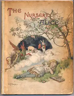 The Nursery "Alice" (1889/90)[1] is an abridged version of Alice's Adventures in Wonderland (1865) by Lewis Carroll, adapted by the author himself for children "from nought to five". It includes 20 of John Tenniel's illustrations from the original book, redrawn, enlarged, coloured – and, in some cases, revised – by Tenniel himself. The book was published by Macmillan a quarter-century after the original Alice. It features new illustrated front and back covers in full colour by E. Gertrude Thomson, who was a good friend of Carroll.[2] The book was 'engraved and printed' by the famous colour printer Edmund Evans.