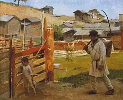 As an interlude, the focus shifts to two farmhands, Kaappo and Salttu, who have been drinking on the job and, thoroughly inebriated, are wallowing in self-pity.[5] The arrival of the Sheriff interrupts the revelry. Although the Ostrobothnian farmers despise him for his brutal and oppressive tactics, they all nonetheless remove their hats out of deference to the law. The Sheriff demands to see Antti's travel paperwork, which Jussi comes forward to provide, but without removing his hat. Offended, the Sheriff strikes his whip, knocking Jussi's hat to the ground. Jussi, however, manages to grab the whip and defiantly breaks it in half. The sheriff departs, threatening reprisals for any future insolence.[5]