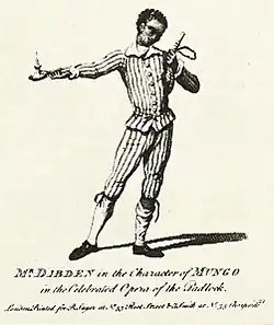 An actor named John Moody, who was supposed to have been familiar with the dialect of the blacks in the West Indies, was originally scheduled to play the part. However, in the end, Dibdin stood in for him. Audience reactions to Dibdin's performance were overwhelmingly positive, and in 1787, he spun his fame as Mungo into a one-man show wherein he sang, gave speeches, and did impressions of black people.