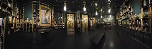 Harmony in Blue and Gold: The Peacock Room (better known as The Peacock Room[1]) is a work of interior decorative art created by James McNeill Whistler and Thomas Jeckyll, translocated to the Freer Gallery of Art in Washington, D.C., which is part of the Smithsonian's National Museum of Asian Art. Whistler painted the paneled room in a unified palette of blue-greens with over-glazing and metallic gold leaf. Painted between 1876 and 1877, it now is considered one of the greatest surviving Aesthetic interiors, and best examples of the Anglo-Japanese style.[2]