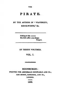 The Pirate was published in three volumes by Constable and Ballantyne in Edinburgh on 24 December 1821 and by Hurst, Robinson, and Co. in London two days later.[5] As with all the Waverley novels before 1827 publication was anonymous. The print run was 12,000, though 2000 of these were a late afterthought which resulted in a bibliographical complication. The price was one and a half guineas (£1 11s 6d or £1.57½). It is unlikely that Scott was involved with the novel again until March and then August 1830 when he revised the text and provided an introduction and notes for the 'Magnum' edition in which it appeared as Volumes 24 and 25 in May and June 1831.