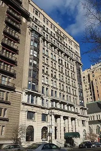 The Prasada is a luxury apartment house at 50 Central Park West on the Upper West Side of Manhattan in New York City. Built between 1904 and 1907, it is a contributing building in the Central Park West Historic District. It cost $250,000 (the equivalent of more than $7 million in 2022). Originally, it contained three luxury apartments per floor: an eight-room apartment at the rear and two ten-room apartments facing Central Park in the front. Servants' bedrooms, bathrooms, kitchens, and other rooms were located facing the court.[1] The building surrounds an open court, with stained-glass skylights illuminating the lobby.