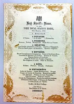 The second Royal Station Hotel opened on 20 May 1878.[2] Designed by architect William Peachey of the North Eastern Railway,[3] the hotel was an integral part of the new station. As the North Eastern Railway Company's flagship hotel, it was managed directly by the railway.[5] It featured elegant, high-ceilinged banqueting rooms and 100 large bedrooms costing 14 shillings a night. It was built by Lucas Brothers.[6]