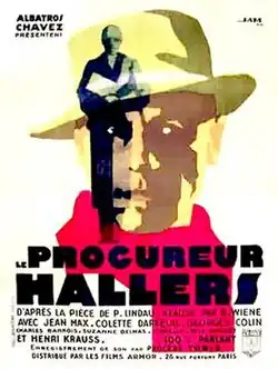 The Prosecutor Hallers (French: Le procureur Hallers) is a 1930 French drama film directed by Robert Wiene and starring Jean-Max, Colette Darfeuil and Suzanne Delmas. It was the French-language version of the German film The Other based on the play Der Andere by Paul Lindau. The two films were made at the same studio in Berlin, with Wiene beginning work on the French version immediately after finishing the German film.[1]