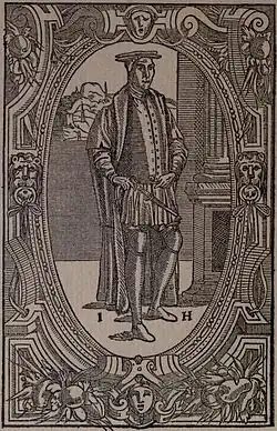 Heywood was born in 1497, probably in Coventry, and moved to London sometime in his late teens. He spent time studying at Broadgates Hall (now Pembroke College), Oxford, but did not obtain a degree. His language skills can be seen by his adaptation of his play Johan Johan from the French La Farce du pâté. His name first appears in the King Henry VIII's Household Books in 1519 as a 'synger', a job for which he received quarterly payments of 100 shillings. In 1521 he began receiving annual rents from lands in Essex, lands recently seized by the crown which made Heywood wealthy and propertied.[4] In 1523, he received the freedom of the City of London with the help of Henry VIII. At Michaelmas 1525 he received £6. 13s. 4d. as a 'player of virginals'.[5] At about the same time he married Jane Rastell, the niece of Sir Thomas More. Through this marriage, Heywood entered into a very theatrical family. Jane's father John Rastell was a composer of interludes and was the first publisher of plays in England.[6] When Rastell built his own house in Finsbury Fields, he built a stage explicitly for the performance of plays, and his wife made costumes. It appears that the whole family, including Thomas More, were involved in these productions. In this private theatre, Heywood found an audience for his early works, and a strong artistic influence in his father-in-law. In the 1520s and 1530s, he was writing and producing interludes for the royal court. He enjoyed the patronage of Edward VI and Mary I, writing plays to present at court. While some of his plays call for music, no songs or texts survive.[3]