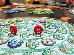 The Quacks of Quedlinburg is played using a main game board with a scoring track, individual "pot" player boards with a spiral potion track, and cloth bags for each player. It also uses coloured tokens (white, blue, green, purple, red, and yellow) that have point values from 1 to 4. Different coloured tokens have different, mainly helpful, abilities.[2] However, in addition to one orange and one green token, each player starts the game with a number of white "cherry bomb" tokens of various point values in their bag. If the total point value of white tokens in a Quacksalber's potion exceeds 7, then the potion explodes.[3] Each player has a flask they can use to put a drawn white token back into their bag, as long as the token wouldn't cause the potion to explode.