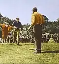 In 1952 A.H. Weiler of The New York Times viewed the film "as darlin' a picture as we've seen this year," with "dialogue that is as tuneful as a lark's song."[23] In another contemporary review, the entertainment trade paper Variety called the picture "beautifully filmed" and wrote that "Wayne works well under Ford's direction," but found the 129-minute running time "unnecessary."[24] Harrison's Reports described the film as "a delightful and rollicking comedy melodrama of Irish life, directed with skill and acted with gusto by a fine cast."[25] Richard L. Coe of The Washington Post declared it "a complete jim-dandy ... The photography is glorious and Victor Young's score, inspired by folk airs, is a complete joy for an exuberant, vigorous picture."[26] Philip Hamburger of The New Yorker was not so taken with the film, writing, "If am to believe what I saw in John Ford's sentimental new film, The Quiet Man, practically everybody in Ireland is just as cute as a button," adding, "Mr. Ford's scenes of the Irish countryside are often breathtaking ... but the master who made The Informer appears to have fallen into a vat of treacle."[27]