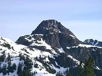 The mountain was climbed in 1931 by local climbers Geoff Capes and Jack Gregson; they left a note in a cairn at the summit naming it "The Pillar". (Ruth Masters, Comox & District Mountaineering Club)