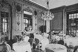 César Ritz once commented that the room was so heavily designed in bronze that it was fortunate that the hotel was built from steel, or the "walls would collapse with the weight of all that bronze".[116] Flanking the entrance to the main restaurant are two life-sized figures set in "bronze vert after Clodion, holding gilded bronze lustres with six lights each, mounted on pedestals of polished Echaillon marble ornamented with bronze".[107] The restaurant and adjacent guest room were designed by P. H. Remon and Sons of Paris. The ceiling is a described by Montgomery-Massingberd and Watkin as a "painted trompe-l'oeil ceiling on which pinkish clouds drift across the blue sky encircled by a garlanded balustrade". Bronze chandeliers are also a feature, influenced by an 18th-century Augustin de Saint-Aubin engraving known as Le Bal Pare et Masque,[119] and Le Festin by Moreau le Jeune, which was given by the City of Paris to the King and Queen on 21 January 1782.[116]