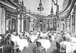 The hotel was designed mainly by London and Paris based designers in the Louis XVI style, which is consistent throughout, giving the hotel its "special atmosphere of perfect appropriateness and elegant restraint".[103] Marcus Binney describes the great suite of ground-floor rooms as "one of the all-time masterpieces of hotel architecture" and compares it to a royal palace with its "grand vistas, lofty proportions and sparkling chandeliers".[104] Waring & Gallow were responsible for many of the fine design work of the interiors The ground floor plan dated to 1906 illustrated a large main restaurant overlooking the terrace and garden, a large central Grand Gallery and Winter Garden, a circular vestibule beyond the reception room, the Marie Antoinette Suite near the restaurant, and numerous shops.[105]