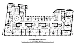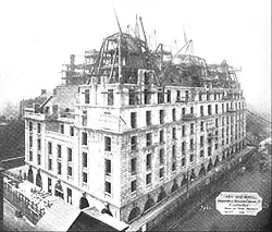 Excavation for the hotel began by contractors Waring White Building Co. Ltd in June 1904, and it was completed by 1 October 1905, and opened the following May.[96] The building progress was documented each month by The Builder's Journal and Architectural Engineer, and in one edition noted the difficulties of some of the aspects of construction such as hoisting 20-ton 39 feet (12 m) steel joists in a narrow building site. The Architect and Contract Reporter noted that the limited space did not allow for the storage of materials on site. All mortar had to be mixed in the basement and the stone was dressed "on a platform with a watertight roof over the footway".[97] The red-brick foundations of the earlier Walsingham House had to be blasted away to facilitate the foundations of the steel structure in concrete.[98][j]