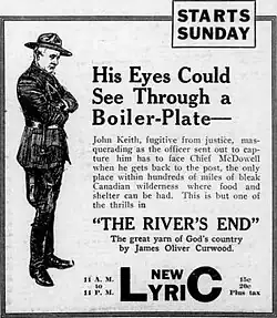 The River's End is a 1920 American silent Western drama film directed by Victor Heerman and Marshall Neilan and starring Lewis Stone, Marjorie Daw, and Jane Novak.[1] It is an adaptation of the 1919 novel of the same name by James Oliver Curwood.