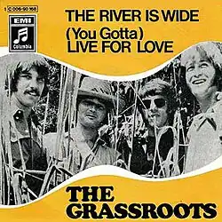 It became a hit for American rock band the Grass Roots. In April 1969, their version of "The River Is Wide" entered the Billboard Hot 100 chart at no. 87,[5] and by May, it had reached its peak position at no. 31.[6] The song appeared on their studio album Lovin' Things, which was released the same year. It later appeared on the band's compilation albums More Golden Grass and Their 16 Greatest Hits, which were released in 1970 and 1971 respectively.[7] The song has also been included on multiple subsequent compilations by the group. The single version does not contain the thunder present at the beginning of the LP version, and is also in a different key.