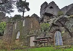 The Roaches is the site of the Don Whillans Memorial Hut, also known as the Rockhall Cottage. This Grade II listed building may have been a shooting box, and is built in cottage orné style.[14]