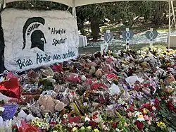 Shortly after a mass shooting on February 13, 2023 that killed 3 MSU students and wounded 5, the Rock was painted black with the text "How many more?" and "Stay Safe MSU."[14] On February 15, the message had been painted over to show a message apparently supporting gun rights. The gun-rights message was replaced the same day with a memorial to the three deceased victims.[15] The same day, the university commissioned Madison Heights-based muralist Anthony Lee to create a more permanent memorial. Lee's artwork included the Spartan logo and the message "Always a Spartan. Brian. Arielle. Alexandria." The artwork by Lee was the centerpiece of a long-running memorial at the site, which remained on the Rock until July 2023, the longest-running message to date.[16][17]