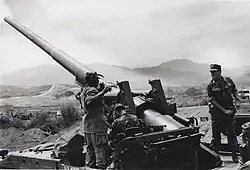 When it was first observed in July 1966, there was still a large enemy force operating at the base and in the shadow of the Rockpile. The fight for the mountain occurred during Operation Hastings and involved 8,000 Marines and 3,000 South Vietnamese soldiers. The base at Dong Ha was used as a staging area to mount an attack on the DMZ and the area around the Rockpile. Brigadier General Lowell English, a commander in charge of Operation Hastings, stated that the Marines sought to take the North Vietnamese by surprise on their crucial infiltration routes and to smash and destroy their force in the DMZ region before they had a chance to regain balance or momentum. By the operation's end on 3 August 1966 the United States had accounted for at least 824 confirmed PAVN soldiers killed and 214 captured weapons compared to the 126 Marines killed and 448 wounded.[10] The Rockpile officially came under the control of American troops by the end of July 1966 when a small observation team landed on the summit. The PAVN immediately attempted to remove the Marines from their defensive position, but several attempts at scaling the Rockpile and striking the top and sides with mortar rounds proved ineffective. Operation Prairie swung the momentum for the mountain's fight after waves of Marines stormed into the area to reinforce the troops around the Rockpile and fortify its defenses.[9] From then on the Rockpile was often manned by at least a squad of United States Marines, who received supply drops by helicopters and would go on to launch numerous operations from the base of the mountain.[4]