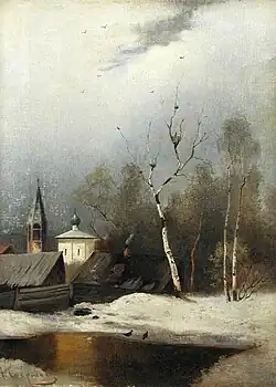 The reason why the artist Savrasov left Kostroma for Molvitino, located more than 50 versts north of the provincial centre, remains unclear to researchers. There are different versions on this subject. In one of his stories, the writer Vasily Osokin recounts an encounter between Savrasov and a peasant at the Kostroma market. The peasant mistook Savrasov for a iconographer and asked if he was going to Molvitino, a village with an unusual name that pleased the artist. Savrasov confirmed that he was indeed going there and accepted the peasant's offer of a lift.[41] Kostroma's local historian Nikolai Zontikov believed that this version is "a figment of the writer's imagination" and wrote that "it is only regrettable that it was included in some works about Savrasov as an indisputable fact."[42]