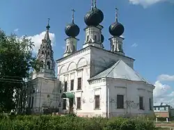 Savrasov travelled to Molvitino from Kostroma, which was then part of the Molvitino parish in the Buysky Uyezd of Kostroma Governorate (now Susanino, the administrative centre of Susaninsky district in Kostroma Oblast),[38] where he painted the sketches for his future canvas The Rooks Have Returned.[8][9][10] In an 1871 pamphlet on the Kostroma Governorate, these places were described as follows: "The location of Molvitin is beautiful. It is situated at the end of a high mountain, protruding into the valley in the form of a promontory, between two rivers, which under Molvitin join each other."[39] The Resurrection Church, which still stands today, served as the prototype for the temple depicted in the painting. Construction of this stone church began in the early 1680s and was completed in 1690, likely by an artel of Yaroslavl masters. Only the bell tower has remained unchanged since the end of the 17th century. The temple itself has undergone several reconstructions, with the last significant changes dating back to 1855–1857, before it was depicted in Savrasov's painting. The church now serves as the Ivan Susanin Museum.[40]