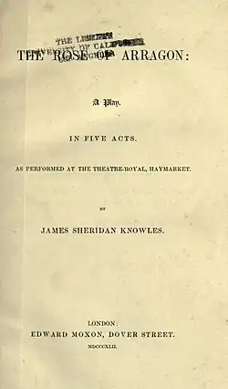 The Rose of Arragon is an 1842 tragedy by the Irish-born writer James Sheridan Knowles. It premiered at the Theatre Royal, Haymarket in London on 4 June 1842.[1] The cast included Ellen Kean as Olivia, Charles Kean as Alasco, Henry Howe as the King of Arragon, Samuel Phelps as Almargo and Frederick Vining as Velasquez. It was similar in style to Knowles' earlier work The Wife of Mantua.[2] In 1849 William Creswick opened his actor-management of the Surrey Theatre by playing Alasco in a revival.