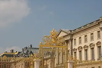This gate was the work of several ironworkers associated with its elaboration and installation: Luchet, Marie, Godignon, and Belin, considered the best professionals in their field at the time. Gilded and ornamented with rich pillars or pilasters, the gate opened through two portals that gave onto two lateral courtyards called "Cours des Princes" and "Cours de la Chapelle." The old gate then extended between the columns of the pavilions of the side wings located at the end of the castle, which the Dufour pavilions and the Gabriel wing have now replaced. Then, this gate curved in a quarter circle on the courtyard of Honor to end on two stone sentry boxes, which were used as a guardhouse.[1]