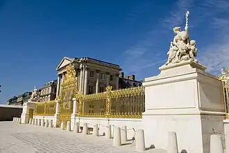 On the contrary, according to Béatrix Saule, director of the castle museum, this new project is in line with the interventions carried out since the beginning of the 20th century, which aim to present the royal estate in a state that best reflects that of the end of the Ancien Régime.[10] From a functional point of view, the gate must, first of all, serve to control the flow of visitors:[11] whereas the castle formerly presented a multitude of hardly identifiable visitor circuits, the gate makes it possible to direct visitors towards more obvious entrances, and to use the royal courtyard, now integrated into the visit, to facilitate the distribution of the apartments. Finally, suppose the gate is a new work made according to the old plans. In that case, the two sculpted groups on top of the gatehouses (Peace, by Tuby, and Abundance, by Coysevox) are perfectly authentic: they had been replaced in the forecourt and have found, after restoration, their original location.[12]
