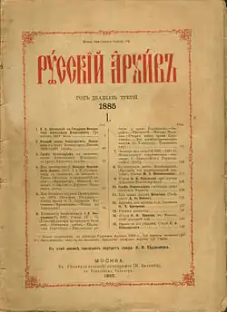 Russky Arkhiv (Russian: Русский архив/Русскій Архивъ, Russian Archives) was a Russian historical and literary monthly (in 1880–1884, a fortnightly) magazine, published in Moscow in 1863–1917. Conceived originally by Alexey Khomyakov, it was launched and edited by Pyotr Bartenev, with a view to giving its readership the full and objective account of Russian history.[1]