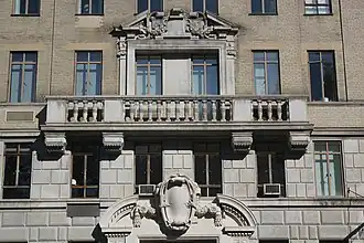 On Central Park West, bays 5–8 and 19–22 contain balconies at the fourth story. The balconies project from the facade and are supported by four console brackets. Behind each balcony, the two middle openings (bays 6–7 and 20–21) are surrounded by a limestone frame and separated from each other by a limestone wall panel. Above this frame is a triangular broken pediment with an escutcheon, garland, and tablet at its center.[41] In bays 5–8 and 19–22 on the 11th story, there are two more balconies supported by four console brackets. Behind each balcony, bays 6–7 and 20–21 are recessed at the 11th and 12th stories and are flanked by brick pilasters; the recessed walls are decorated with embossed rosettes. Above the 12th story, and between bays 6–7 and 20–21, are cartouches with rosettes, similar to those above the main entrances on Central Park West.[41]