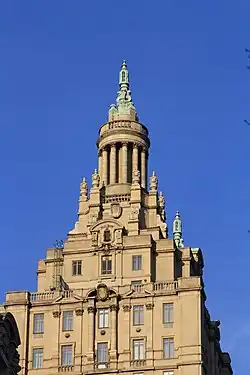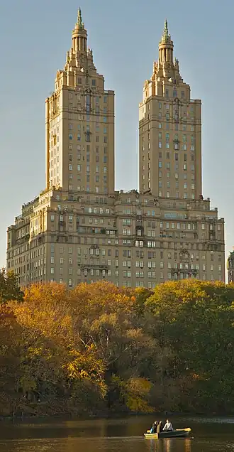 The present San Remo was designed by Emery Roth.[3][1][20] It is variously described as being in the neo-Renaissance[21] or late Italian Renaissance style.[6][22][23] Theodore Hofstatter decorated the building's lobby, while Lou R. Strauss Jr. designed the internal garden and exterior landscaping.[24][25] Unlike other large buildings on Central Park West, which were typically attributed to a single developer, no one took credit for developing the San Remo specifically.[26] The syndicate that developed the San Remo had also erected the Beresford, seven blocks north, shortly before the San Remo was completed.[27]
