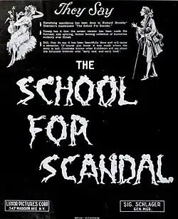 The School for Scandal is a 1923 British silent comedy film directed by Bertram Phillips and starring Queenie Thomas, Frank Stanmore, and Basil Rathbone.[1] It is an adaptation of the play The School for Scandal by Richard Brinsley Sheridan.