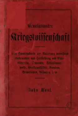 The Science of Revolutionary Warfare (in German: Revolutionäre Kriegswissenschaft) is a revolutionary manual written by the anarchist militant Johann Most in the 1880s. Being the first revolutionary manual in history, it is a work in which the author sought to promote the idea of propaganda by the deed, but also and especially to provide methods for carrying it out—such as manufacturing explosives, poisons, incendiary materials, invisible ink, or other "recipes". Most distinguished himself by drawing most of his information from publicly available sources of his time and by trying to offer affordable and practical methods for his contemporaries.