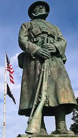 The Sentinel is an 8 foot (2.4 metres)[b] tall cast bronze sculpture of a World War I doughboy atop a granite base.[9][2] Unmodified since its placement in 1924, the artwork faces east. Over time, based on a form of transmutation, the statue has been described as taking on the likeness of Wesley Everest, the lynched Wobbly from the riot, but the NRHP form does not confirm the idea.[2]