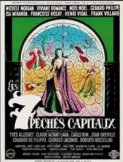 The Seven Deadly Sins (French: Les Sept Péchés capitaux) is a 1952 French/Italian co-production motion picture drama.[2] The film stars Michèle Morgan, Françoise Rosay, Viviane Romance,[3] Maurice Ronet, Louis de Funès, Isa Miranda, Henri Vidal and Gérard Philipe.[4] It has seven separate sections: ("Pride/L'Orgueil", "Lust/La Luxure", "Sloth/La Paresse", "Envy/L'Envie", "Avarice and Anger/L'Avarice et la colère", "Gluttony/La Gourmandise", "The Eighth Sin/Le Huitième péché") with five episodes from France, and two episodes from Italy.[5]