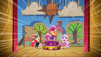![]() The Cutie Mark Crusaders perform an overdramatic rock song at their school talent show. | |