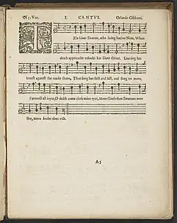Gibbons himself is occasionally proposed as the text's author, but there is no evidence for this suggestion.[33] None of the Madrigals and Motets texts are known to have been set before Gibbons,[35] and "The Silver Swan" text was not set by other composers until the 20th century.[36] It as often assumed that Hatton chose all, or at least some, of the texts.[35] Given his possible textual involvement and supposed proximity to Gibbons during the compositional process, musicologists such as Frederick Bridge have speculated that Hatton wrote some or all of the poems in the set.[37] Harley considers the text inspired by Giovanni Guidiccioni's Italian poem "Il bianco e dolce cigno" (lit.'The White and Sweet Swan'), which was frequently set to music by composers such as Jacques Arcadelt.[38] In another setting by Orazio Vecchi, Guidiccioni's poem was translated into English by Nicholas Yonge as "The white delightful Swanne [sic] sweet singing dyeth" for book two of his 1597 Musica Transalpina madrigal collection.[10]