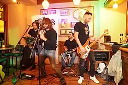 In the period of 1998-2000, the band had already composed three original songs. From 2001, the band’s performances became more often and they began to appear in important live stages such as Mesogeios Live Stage and Café Americain supporting the well established group Blues Wire. In March 2002 they appeared at a concert in the Cultural Center of Thermi, where they performed their original songs live. In November of that year they recorded for the first time one of their songs, "Let’s Go Party". In December they recorded another one of their songs "See How Much I Love You". In July 2003, they recorded "Now Is The Chance" and in September "It's a Pity". In January 2004, the fourth member, Thodoris Nikolaou, bassist, officially joined the band. The same month, the band paid a great tribute to Elvis Presley with a very special gig at Mylos live Stage in Thessaloniki.[5] In February, they recorded "She Is a Liar". In April to May 2005, they supported Blues Wire once again in their appearances at Café Americain. In early 2006, they put on another tribute to Elvis Presley, as well as a series of tribute nights to The Beatles at Mylos Club in Thessaloniki. In November, the band paid tribute to Queen and the late Freddie Mercury, performing numerous songs of their discography. In December, another live tribute for John Lennon was done. In 2007, they continued to perform live tributes, that time to U2 and The Beatles,[6] while making appearances throughout Greece. The appearance supporting Louisiana Red and Blues Wire at Mylos Club in Thessaloniki was a great success. In 2008 The Skelters performed live their song "Let's Go Party" on a very popular Greek TV show, Radio Arvyla. That year, they also supported Iron Butterfly on a concert in Thessaloniki and jammed with Puressence. Moreover, they supported Paul Di' Anno on a concert in Thessaloniki Port.