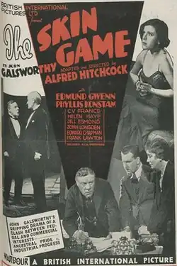 The Skin Game is a 1931 British drama film by Alfred Hitchcock, based on the 1920 play by John Galsworthy and produced by British International Pictures. The story revolves around two rival families, the Hillcrists and the Hornblowers, and the disastrous results of the feud between them.
