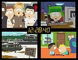 ![]() Mayhem around South Park, shown with a split screen, 24-style. From top left: Hillary Clinton gets hospitalized, Kyle investigates the motive of a terrorist threat, CIA helicopters land in South Park, and Bahir plays checkers with Butters. | |